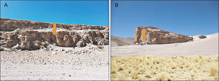 En el caso de Pucará, se trata de una formación sumamente meteorizada con pocas superficies rocosas aptas para ser usadas como soportes rupestres. En una de estas escasas superficies disponibles, circundante a la vega donde se encuentra el puesto de pastores abandonado, se observan los grabados principales en este sector, a una altura de casi 3 m desde la base de la formación (Figura 3A). Este espacio no solo fue usado por pastores en tiempos recientes, sino también por poblaciones prehispánicas, a juzgar por la recolección de artefactos líticos asociados con contextos de finales del Holoceno medio (ver sección anterior). Respecto de la quebrada de Los Farallones, la pared de ignimbrita en la que se realizaron los grabados posee una altura considerable, lo cual permite una gran visualización del espacio circundante y de parte de la cuenca de Ratones. El arte rupestre se encuentra distribuido en cuatro paneles sobre las paredes del farallón del inicio de la quebrada (Figura 3B), localizado de frente a la vega salitrosa que la surca. Los grabados se ubican a alturas variables con respecto a la base de la formación, entre 1,5 m y 4 m aproximadamente, aunque la mayor cantidad de representaciones se concentran entre los 2 m y 3 m de altura. No se pudo desarrollar un estudio sistemático de la evidencia arqueológica presente en sus alrededores, pero sí se han detectado los mencionados artefactos líticos y cerámicos en superficie junto con el alero compuesto por un bloque de roca enfrentado a los paneles rupestres (Figura 3B).