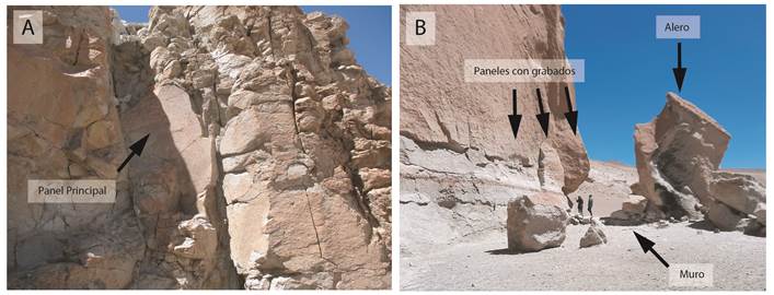 Hacia el sudoeste del salar de Ratones, y a unos 10 km de Cueva Inca Viejo, se ubica la quebrada de Los Farallones, de rumbo general NO-SE, donde se registraron los grabados rupestres (3861 msnm). Se trata de una quebrada limitada por grandes paredones de ignimbrita dacítica, principalmente en el sector sur (Figura 2B). En el fondo de quebrada, hay una pequeña vega con intercalaciones de salitre y sedimento limo-arenoso. En general, el paisaje actual de este espacio es sumamente árido y alejado de poblaciones humanas permanentes. Sin embargo, en el pasado prehispánico pudo ser un lugar relevante para el control de la cuenca y para la circulación humana entre Puna y valles mesotermales. En este sentido, la presencia de motivos rupestres localizados en las paredes de uno de estos farallones podría representar una señalización simbólica del paisaje, como una forma de transmitir información para los grupos humanos en tránsito. Entre el material en superficie, se reconocen artefactos líticos y cerámica, una de ellas asignable a un estilo inca, y un alero asociado con un muro de rocas que se une con el farallón, produciendo un cerramiento del sector (Figura 3B). En el alero aflora una camada de gramíneas que podría indicar un lugar de pernocte o asentamiento de los grupos humanos que circularon por la quebrada. En este marco, se destacan cuatro paneles de grabados rupestres, en su mayoría con motivos geométricos (por ejemplo, círculos, cuadrados, triángulos, etc.), aunque, en menor medida, se relevaron algunos zoomorfos (camélidos) y antropomorfos.