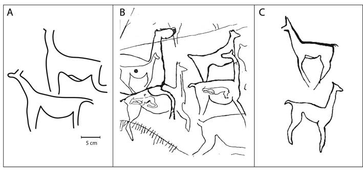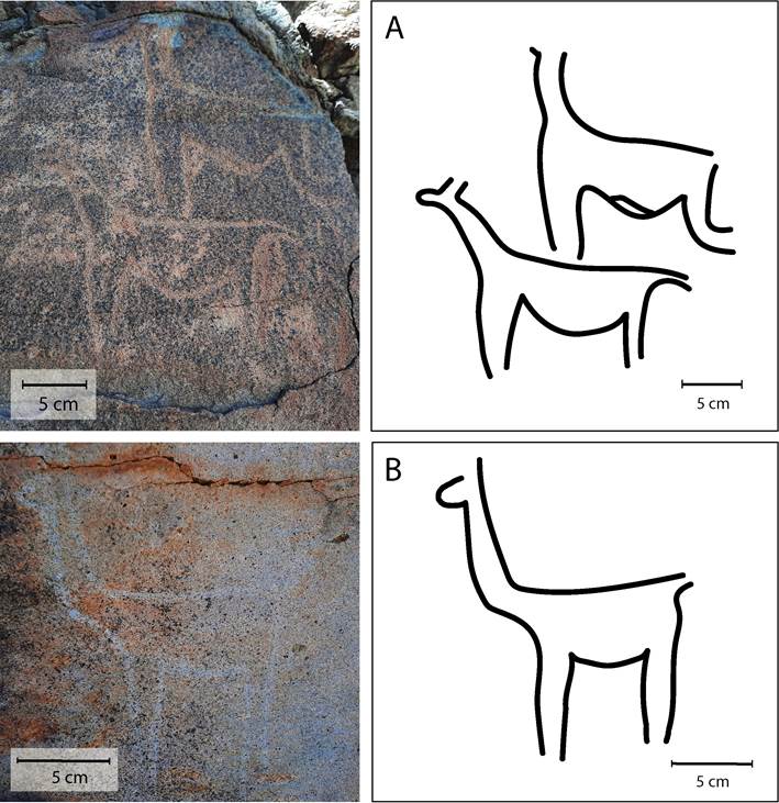 Los motivos relevados en esta quebrada corresponden a camélidos. Hasta el presente, no se han detectado otras representaciones. En la pared sur de la quebrada, se ubica un panel que presenta dos figuras de camélidos asociados entre sí (Figura 4A). Se trata de representaciones confeccionadas por medio de la técnica de grabado. Las figuras corresponden a camélidos naturalistas de perfil (con el cuerpo posicionado hacia el este) con un largo total que varía entre 25 y 30 cm y, en uno de ellos, no se visualiza la cabeza debido a una fisura en la roca que dislocó ese sector, perdiéndose parte del motivo grabado. La cabeza del otro camélido tiene forma triangular redondeada con orejas levemente inclinadas hacia atrás. Además, en ese motivo, se distingue una cola recta aguzada. En ambos camélidos, el lomo es recto y el vientre abultado, mientras que las extremidades son anchas y se afinan hacia la parte inferior. También se pueden ver puntos o incisiones de origen antrópico tanto en el interior de los cuerpos como en sus costados. En un panel cercano de la misma formación rocosa, al oeste, se registra una tercera figura de un camélido de características semejantes a los otros dos motivos (Figura 4B). Sin embargo, se diferencia principalmente por su tamaño algo menor (15 cm de largo total) y por la escasa profundidad del grabado con respecto a los otros dos, observándose un trabajo más superficial.