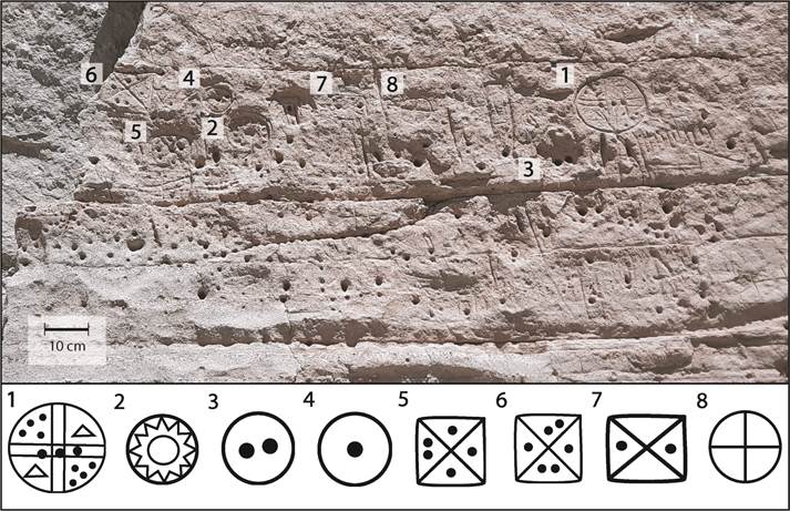 Entre los motivos principales, se destacan representaciones geométricas circulares, triangulares, rectangulares, cuadrangulares y lineales (Figura 6). En particular, se observan algunos motivos complejos por la cantidad de elementos presentes. Uno de ellos, corresponde a un círculo atravesado por líneas dobles en forma de cruz que lo dividen en cuadrantes. En su interior hay triángulos y orificios antrópicos. Estos últimos, se encuentran en línea en el centro del círculo (tres orificios) y tienen simetría en los cuadrantes superior izquierdo e inferior derecho (cuatro en cada cuadrante). Cabe mencionar que los orificios antrópicos son comunes en todos los paneles. También se localizan alrededor de una serie de zigzags sucesivos o en hilera.