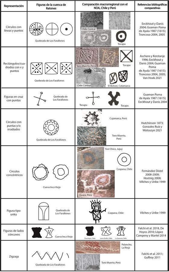 La comparación a nivel macrorregional de los motivos más representativos permitió realizar una primera aproximación estilística y cronológica (Figura 7). Específicamente, se detectaron semejanzas con distintas representaciones del Noroeste argentino, Chile y Perú (Hostnig, 2008; Hostnig y Liz Gonzales Ruiz, 2021; Sepúlveda, 2004; Troncoso, 2004, 2005; entre otros). Con respecto al Noroeste argentino, en diversas áreas se encuentran ciertas similitudes con representaciones de Los Farallones. Específicamente, se han reconocido motivos asignados a distintos períodos, principalmente desde contextos formativos tempranos hasta tardíos/incas. Es el caso de la presencia de círculos, clepsidras, figuras en zigzags o escalonadas y cruces (Aschero, 1999; De Hoyos, 2010; Falchi, Podestá, Rolandi, Re y Torres, 2011; Falchi, Torres y Gutiérrez, 2018; Gentile, Casanova, Grant, Coll y Lane, 2019, López Campeny y Martel, 2014; Martel, Rodríguez Curletto y Del Bel, 2012; Nielsen, Podestá, Falchi, Ávalos, López y Vázquez, 2022; Podestá, Rolandi, Santoni, Re, Falchi, Torres y Romero, 2013; Ratto y Basile, 2012-2014, entre otros). Por ejemplo, en el cercano sitio de Cueva Inca Viejo, el arte rupestre muestra diversos círculos, en algunos casos concéntricos y bicolores (López et al., 2021). Además, se observa una asociación de estas pinturas geométricas con camélidos, varios de ellos en caravanas. Un círculo concéntrico bicolor de rasgos similares fue observado en un sitio de la Puna de Jujuy, asignado a contextos prehispánicos tardíos (Fernández Distel, 2008-2009). Otros motivos comparables en el arte rupestre andino se han relevado en Caspana, norte de Chile, donde se evidencian diversos círculos y camélidos en caravanas, representaciones que corresponderían al Período Inca (Sepúlveda, 2004; Vilches y Uribe, 1999). Esta correspondencia toma incluso más sustento cuando se compara con diseños similares del Cusco, Perú, en el corazón del Imperio inca (Hostnig, 2008).