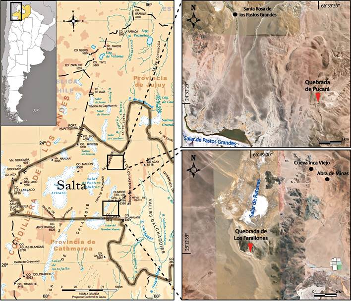 Las cuencas endorreicas de Pastos Grandes y Ratones están compuestas por diversos sectores geoambientales, entre los que se destacan las quebradas y los salares (Alonso, 1999; Turner, 1964). Las principales quebradas de Pastos Grandes se encuentran en la parte norte del área y conforman los espacios de mayor productividad primaria. En este sector, se ubica el sitio Alero Cuevas, la referencia arqueológica y cronológica para el estudio de los procesos de cambio en el área, debido a su larga secuencia de ocupación durante el Holoceno temprano, medio y tardío (López, 2021). Otro sector geoambiental distintivo, compuesto por el salar y sus alrededores, se localiza al sur de la cuenca de Pastos Grandes y presenta ocupaciones humanas, al menos, desde fines del Holoceno medio (López, 2022).