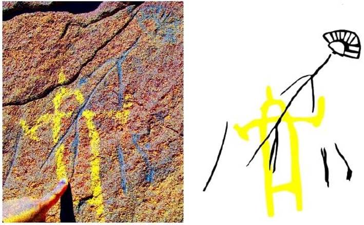 Fuente: elaboración propiaEl segundo panel registrado en Gualfín, denominado “panel fuertecito” (Figura 5c y 5d), se localiza en un afloramiento de grandes dimensiones (2,8 m x 2,2 m máximos) en un cerro en el área de Potrerillos por encima de un sector con infraestructura agrícola y asociado a un camino que conduce al pukara de Gualfín. Consta de tres unidades topográficas de aproximadamente 1,10 m x 0,8 m (UT oeste), 0,5 m x 0,7 m (UT este superior) y 0,25 x 0,30 m (UT este inferior), con manifestaciones grabadas bajo una misma modalidad estilística que no fue identificada para ninguno de los otros grabados en el área de estudio. Se destaca la presencia de antropomorfos con tocados radiales y cuerpos lineales o rectangulares, estos últimos en algunos casos vacíos y en otros con distintos rellenos de líneas verticales u horizontales. Los tocados radiales que portan las figuras humanas son semejantes a los motivos de penachos u ornamentos cefálicos radiales reconocidos en un bloque en la base del pukara de Tacuil (Figura 3d). En las unidades topográficas oeste y este superior, los antropomorfos se agrupan conformando escenas. En el primer caso, una figura humana portando un arco y flecha parece liderar una sucesión de dos camélidos atados que son a su vez pastados o cuidados por un antropomorfo de menor tamaño; a esta escena en tiempos recientes se le ha sobreimpuesto una figura que asemeja un vehículo moderno, tal vez un camión o un carro no motorizado. En el segundo caso, una línea recta con distintos ángulos y salientes cuadrangulares parece obrar de perímetro que delimita un espacio o estructura arquitectónica, dentro de la cual se ubican dos antropomorfos, un grillado rectangular y una serie de líneas que confluyen en un centro, mientras que por fuera se ubican otra figura humana y otro grillado. Estas grillas rectangulares son similares a la que se halla superpuesta sobre las manifestaciones previas en el “panel de los suris”, mientras que para el diseño rectilíneo inferido como una estructura arquitectónica se ha afirmado su semejanza con la planta de la muralla del pukara de Angastaco (Villegas, 2014), asentamiento inca ubicado a 29 km de este sitio. Asimismo, en este panel se identificaron dos casos de superposiciones sobre motivos pintados, los únicos reconocidos en el área de estudio. En la UT oeste, un antropomorfo de cuerpo lineal y tocado radial que no forma parte de la escena con los camélidos fue grabado por sobre una figura humana pintada en amarillo, con cuerpo rectangular y extremidades cortas, similar al mencionado antropomorfo del “panel de los suris”. En la UT este superior, por su parte, la escena de la estructura arquitectónica ha sido impuesta sobre una línea pintada en rojo y un posible antropomorfo amarillo (Figura 6).