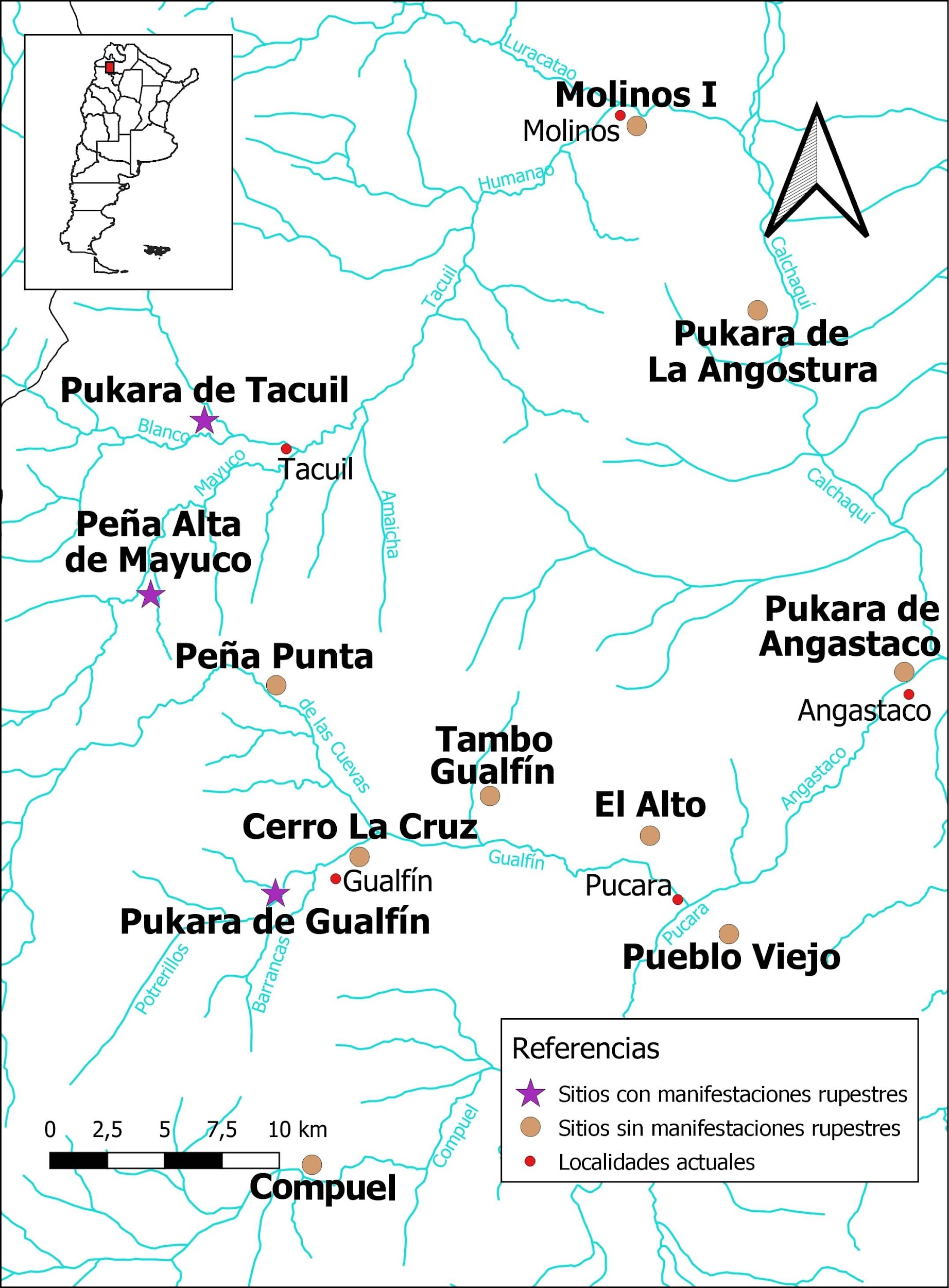 En las quebradas altas del valle Calchaquí medio (cuencas de Molinos y Angastaco, provincia de Salta), las investigaciones realizadas desde hace dos décadas han permitido identificar un profuso registro de manifestaciones rupestres que se despliega en tres tipos de espacios: los pukaras de Tacuil, Gualfín y Peña Alta de Mayuco y su entorno circundante; las vías de circulación hacia la puna (específicamente, la quebrada de Barrancas); y el área en torno a la laguna de Brealito. En el caso de los pukaras, poseen un registro compuesto mayoritariamente por bloques y en menor medida por paredones y afloramientos, dispersos a lo largo de grandes extensiones (más de 150 hectáreas en su totalidad) y en distintas condiciones topográficas en cada uno de los tres pukaras. Se localizan en la cumbre de las mesetas, en sus senderos de acceso, en los poblados bajos asociados y en las áreas agrícolas circundantes. Estos soportes presentan una alta frecuencia y diversidad de manifestaciones fundamentalmente grabadas (Williams y Villegas, 2013; Williams y Castellanos, 2014, 2018; Williams ,2019; Williams, Villegas y Castellanos 2020). En contraste, en la quebrada de Barrancas, que conecta con la puna al sur del Cerro Gordo siguiendo el río Mayuco y un afluente del río Gualfín, se registran gran cantidad de motivos principalmente pintados, desplegados en aleros de grandes dimensiones: Huayco Huasi e Ichiu. Esta quebrada resulta particularmente relevante por ser vía de conexión con el área puneña de Antofagasta de la Sierra, para la cual se han propuesto interacciones con el valle Calchaquí medio de intensidades y restricciones variables en el tiempo (Martel, 2014). Finalmente, el arte rupestre en el sector serrano de Brealito se localiza en las inmediaciones de la laguna homónima y está constituido por aleros y bloques dispersos en los que se han registrado diversos motivos pintados (Williams, Orsini, Benozzi y Castellanos, 2014).