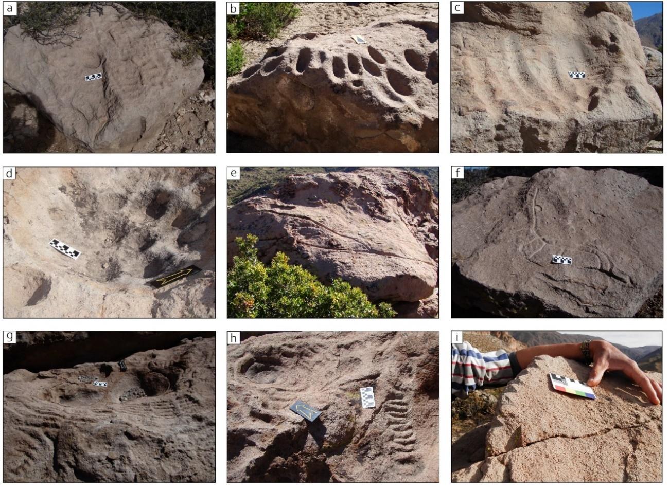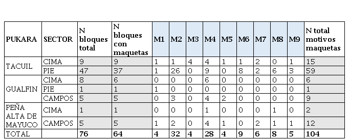 Se definieron 9 tipos de motivos implicados en la producción de las maquetas: 1) horadaciones ovoidales (M1); 2) horadaciones circulares (M2); 3) horadaciones profundas (M3); 4) líneas (M4); 5) líneas unidas a horadaciones (M5); 6) líneas paralelas agrupadas (M6); 7) líneas serpenteantes de curva cerrada (M7); 8) hondonadas (surcos/campos profundos) (M8); 9) aristas modificadas (M9). Su cuantificación y distribución en los sectores de cada uno de los pukaras, sumando un total de 104 motivos individualizados, se especifica en la Tabla 2, mientras que pueden verse ejemplos de cada uno de estos tipos en la Figura 2.