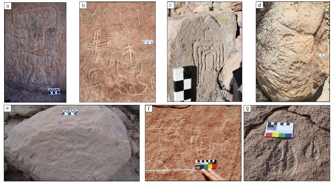 Al igual que con las maquetas, también con estos otros motivos se evidencia una distribución diferencial, tanto en términos de su despliegue en paneles (85:174) o en bloques (89:174), como según la manera en la que se distribuyen en los distintos sitios y sectores (Tabla 1). En primer lugar, en cantidad de motivos (83:174) se ubica la base del pukara de Tacuil, con manifestaciones grabadas en bloques dispersos y en paneles sobre la ladera del afloramiento. También se evidencia una concentración de motivos (77:174) en los campos agrícolas de Gualfín, dada la existencia de dos paneles de gran tamaño con una profusión de manifestaciones (ver página 14). Estos paneles son los únicos soportes de los sitios estudiados en los que se han identificado motivos pintados, contabilizando 2 en total. Los restantes 14 motivos que no configuran diseños de maquetas se localizan: 2 en bloques en la cima del pukara de Gualfín, 11 en bloques en la base de Peña Alta de Mayuco y 1 en la cumbre del pukara de Tacuil. Sobre este total de 174 motivos fue posible realizar una segmentación preliminar en diseños no figurativos (114) y figurativos (60). Entre los primeros, que en su mayoría se despliegan sobre los paneles de los campos agrícolas de Gualfín, se encuentran distintas variedades de figuras y composiciones geométricas: círculos, óvalos, rectángulos, grillados y líneas rectas y sinuosas. En cuanto a los figurativos, se observa un repertorio en el que a nivel general destacan motivos y temas como los escutiformes, los agrupamientos de figuras humanas con distintos objetos y vestimentas, las hachas, tumis, unkus y tocados, y las huellas y alineaciones de camélidos con o sin asociación con figuras humanas (Figura 3).