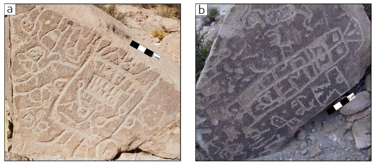 Finalmente, una última característica general del registro rupestre en los sitios analizados se relaciona con su adscripción cronológica. Al respecto y, si bien esto necesita ser calibrado con la continuidad de los trabajos en el área, las manifestaciones diagnósticas identificadas se corresponden en su mayoría con los patrones y cánones definidos para los Períodos Tardío e Inca, lo cual es coherente con las principales evidencias de ocupación en los tres asentamientos. En primer lugar, como fue señalado las maquetas son habitualmente vinculadas con dinámicas sociales incaicas y en menor medida de las poblaciones locales del Tardío. En segundo lugar, dentro de los motivos figurativos, se encuentran los escutiformes, los agrupamientos de figuras humanas con distintos objetos y vestimentas, las hachas, tumis, unkus y tocados, y las huellas y alineaciones de camélidos, todos ellos diagnósticos de los lenguajes visuales que circularon en el NOA entre los siglos X y XVI. En diversos sitios de regiones valliserranas y puneñas vecinas en las provincias de Salta y de Catamarca se han reconocido manifestaciones rupestres cronológicamente adscritas al Tardío-Inca semejantes a las registradas en los sitios del área de estudio: cuenca de Ratones, quebrada del Toro, Cachi-Payogasta, Cafayate, quebrada de Las Conchas, Guachipas y Antofagasta de la Sierra (Aschero, 2000, 2006; de Hoyos, 2021; Lanza, 2010; Ledesma, 2015; López, Seguí y Solá, 2021; Podestá et al., 2013; entre otros).
