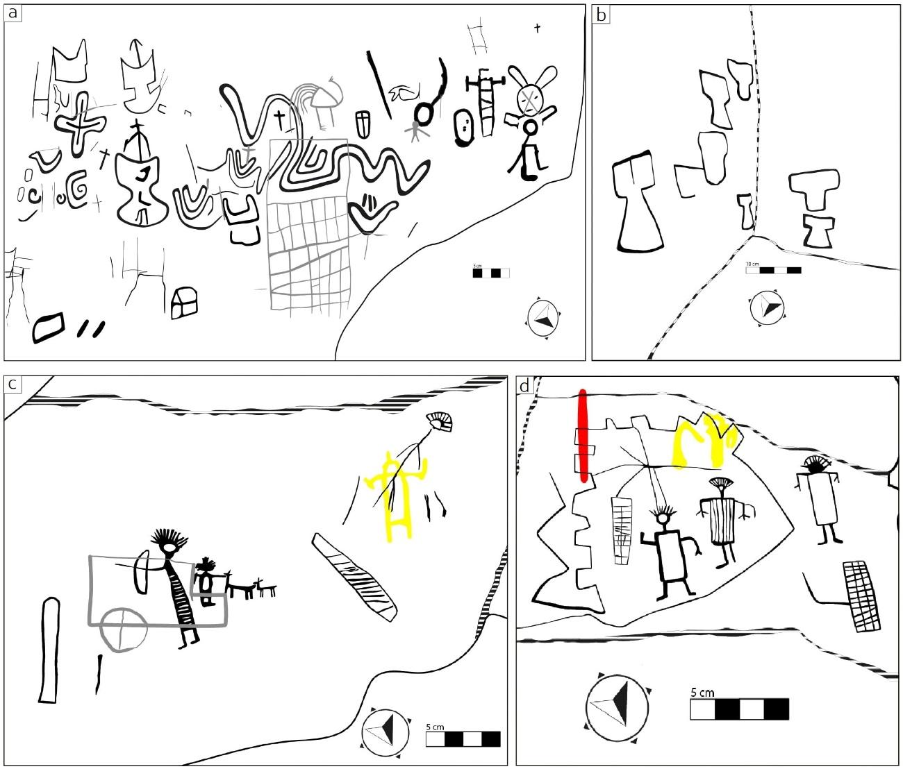 a) panel de los suris (Gualfín). b) panel de los escutiformes (Tacuil). c) panel fuertecito, UT oeste. d) panel fuertecito, UT este superior.