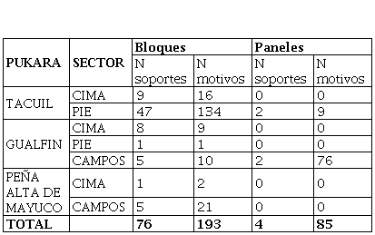 Tabla 1. Cuantificación de soportes y motivos identificados por sectores de cada sitio