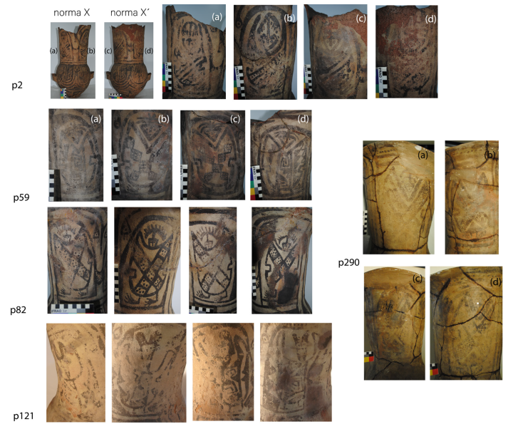 La urna p288 es un caso publicado en la primera parte (Nastri et al., 2019:68, f. 9a), de antropomorfos de cuerpo completo con idénticos blasones de serpientes curvi-rectilíneas bicéfalas y arreglos cefálicos en forma de arco emplumado hacia arriba (Figura 2:1.3), estructura de diseño del cuerpo de la urna tripartito, con suris felinizados. La diferencia sutil se aplica en la forma de los ojos de los antropomorfos: de simples puntos en (a) y (c) y de rayas en (b) y (d). No descartamos la existencia de más diferencias dado el mal estado de conservación de la pintura.