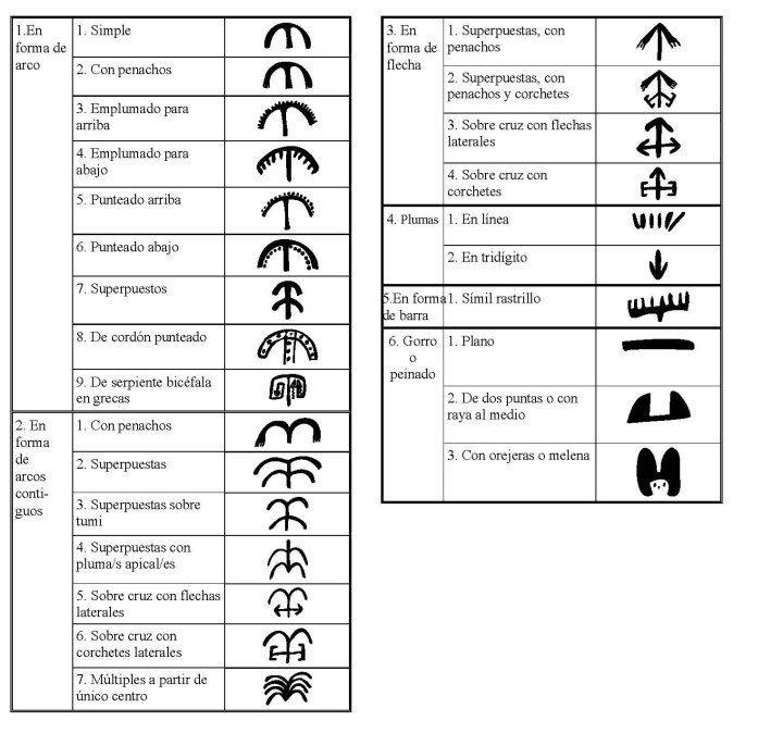 Adentrándonos ya en el estudio del motivo escutiforme en la muestra de piezas que sólo exhiben esta variedad de antropomorfo, uno de los dos aspectos al que hemos prestado mayor atención en la descripción es el de los arreglos cefálicos, dentro de los cuales incluimos tanto adminículos dispuestos sobre la cabeza como también peinados del cabello, dado que en varios casos no podemos establecer con seguridad qué parte corresponde a pelo y cual a algún objeto como ser gorro, sombrero, tocado de plumas, etc. Atendiendo a sus características formales principales, reconocimos 26 sub-tipos (Figura 2), distribuidos en seis tipos generales. Además, hay un número de casos en el que los arreglos están ausentes y, por supuesto, muchos otros en los cuales no es posible reconocer ya sea su presencia o ausencia, o bien el tipo. También, como señalaré a continuación, existen casos en los que el último tipo general de ornamento cefálico – gorro o peinado (Figura 2:6)- coexiste con alguno de los anteriores, en cuyo caso consignamos en la tabla ambos atributos según sus respectivas signaturas (Tabla 2). Confiamos en que, tras esta primera presentación, la observación de otros casos a la luz del esquema clasificatorio introducido permitirá el perfeccionamiento de este último, o incluso su reemplazo por otro más adecuado, tal como suele ser el caso cuando se usan clasificaciones. Los rótulos pueden considerarse como arbitrarios, más allá de que preferimos utilizar nombres descriptivos, en lugar de, por ejemplo, números, a los fines de facilitar su referencia sin necesidad de consulta a alguna lista aclaratoria. Es muy posible que las variantes en forma de arco (Figura 2:1) remitan a objetos de madera de similar contorno al de un tumi (cuchillo ceremonial incaico) sujetos a cascos con estructura de madera cubiertos de lana, tal como se han preservado en el desierto de Atacama (Berenguer, 2006). La consideración de las posibles correspondencias entre formas de arreglos cefálicos y objetos reales del pasado, amerita un trabajo aparte. Aquí recurrimos a términos que aluden a la forma a los fines de una primera clasificación que permita observar tendencias generales preeliminares. Coherentemente con la integración de las muestras aludida supra, a los tipos de arreglos cefálicos[11] descriptos en esta nueva muestra, agregamos aquellos presentes en la muestra de casos publicados hasta 2016 (Nastri et al., 2019).