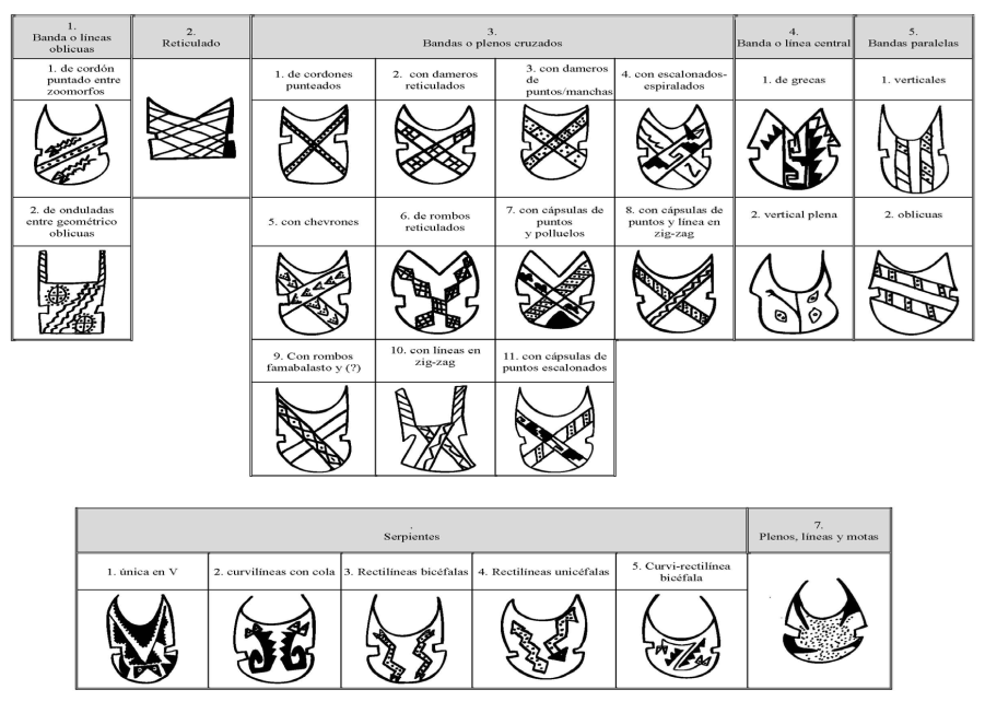 Fuente: Elaboración propiaAl igual que en las tres fases anteriores, en la fase 4 existen dos formas principales de organización del diseño en el cuerpo de la urna: aquella que se ha dado en llamar “tripartita”, o “a”; y, la segunda, “con brazos” o “b” (Podestá y B. de Perrota, 1973; Nastri, 1999, 2008, etc.). La muestra aquí analizada confirma lo visto años atrás respecto de una distribución equilibrada de las distintas modalidades también durante la fase 4, a diferencia de lo planteado por Podestá y B. de Perrotta en su estudio de la colección Muniz Barreto (Podestá y B. de Perrotta, 1973; Nastri y Coll Moritan, 2009). La estructura de diseño “con brazos” está presente en el 46% de los casos de nuestra muestra, mientras que la forma “tripartita con banda central” da cuenta de un 43%. Finalmente, un único caso (4%) presenta la variedad de “serpiente-brazos” que definimos en otro trabajo (Nastri, 1999), y que bien podría considerarse como un sub-tipo de la estructura “con brazos”; y dos urnas (7%) exhiben otro tipo minoritario que Podestá y B. de Perrota dieron en llamar “por fuera de la bimodalidad” (Podestá y B. de Perrotta, 1973).