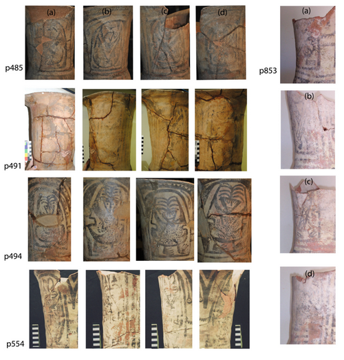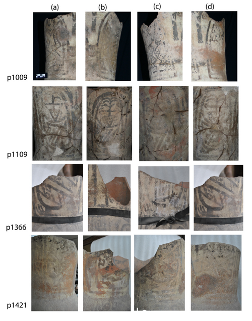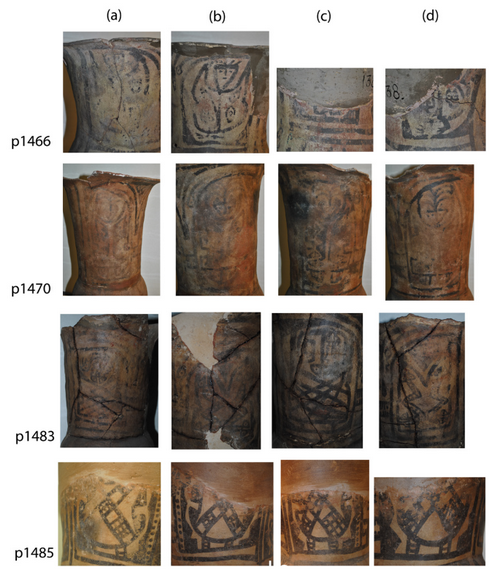 La urna p1421 también pertenece a la colección Muniz Barreto y al igual que en la anterior, la fragmentación del cuello no permite conocer la manifestación de las porciones superiores de los antropomorfos (Figura 5). Y siendo también pobre la preservación de la pintura, apenas se puede reconocer el tipo de blasones en dos de los casos, en los cuales se trata de bandas cruzadas, mientras que en los otros dos se puede asignar al tipo particular: bandas cruzadas con cápsulas de puntos y escalonados (Figura 3:3.11).