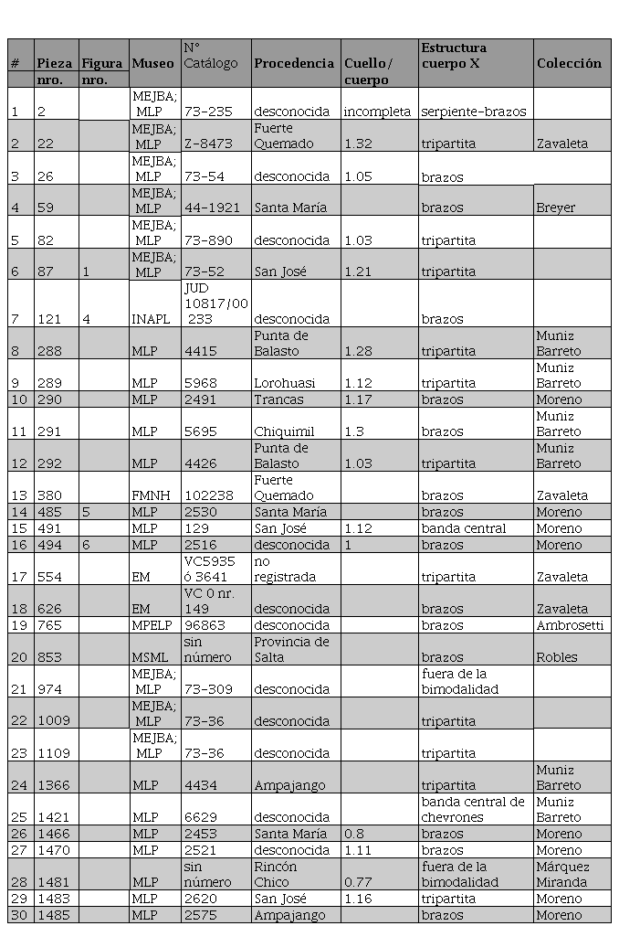 Abreviaturas de Mueos: INAPL (Instituto Nacional de Antropología); FMNH (Field Museum of Natural History); MEJBA (Museo Etnográfico Juan Bautista Ambrosetti); MLP (Museo de La Plata); MPELP (Museo Prehistórico y Etnográfico Luiggi Piorini); MSML (Museo de Antropología de Salta Juan Martín Leguizamón).