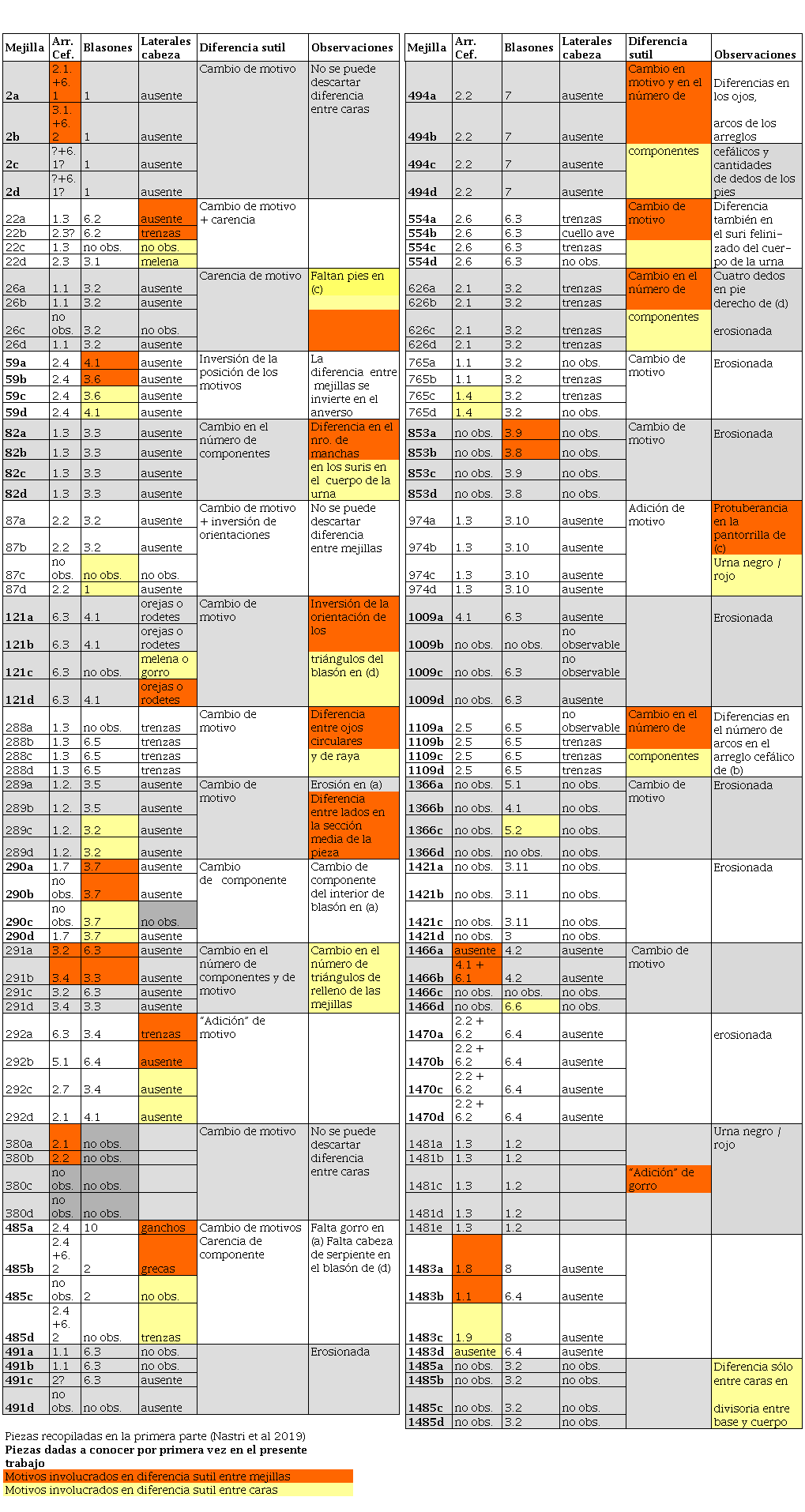Hemos visto que hay casos en los cuales la diferencia entre una y otra mejilla de una cara de la pieza, se duplica en la cara opuesta, mientras que, en otros casos, no se verifica dicha repetición. En esta última situación, tenemos además de la diferencia entre mejillas de una cara, diferencia entre caras. Cuando la misma diferencia entre mejillas se presenta tanto en el anverso como en el reverso, entonces no hay diferencia entre caras. Luego hemos detectado un caso especial que es el de repetición de la diferencia en las mejillas en ambas caras, pero en posiciones invertidas: por ejemplo, aquello que en X está del lado izquierdo, en X´ se encuentra en el derecho. Teniendo en cuenta estas distintas formas de manifestación del recurso, puede señalarse entonces que todas las piezas santamarianas de la muestra cuyos motivos pintados se han conservado en su totalidad exhiben la presencia del recurso de la diferencia sutil. En la tabla se destacan en color naranja cuando las mejillas de una misma cara exhiben contrastes entre sí, y, en amarillo, cuando hay diferencia entre caras. Todos los casos en los que se puede confirmar la presencia sólo de una u otra forma de estas manifestaciones, presentan mejillas o sectores de las piezas faltantes o con pintura no conservada, lo cual impide descartar la presencia de la manifestación del recurso en el nivel faltante (entre mejillas o entre caras).
