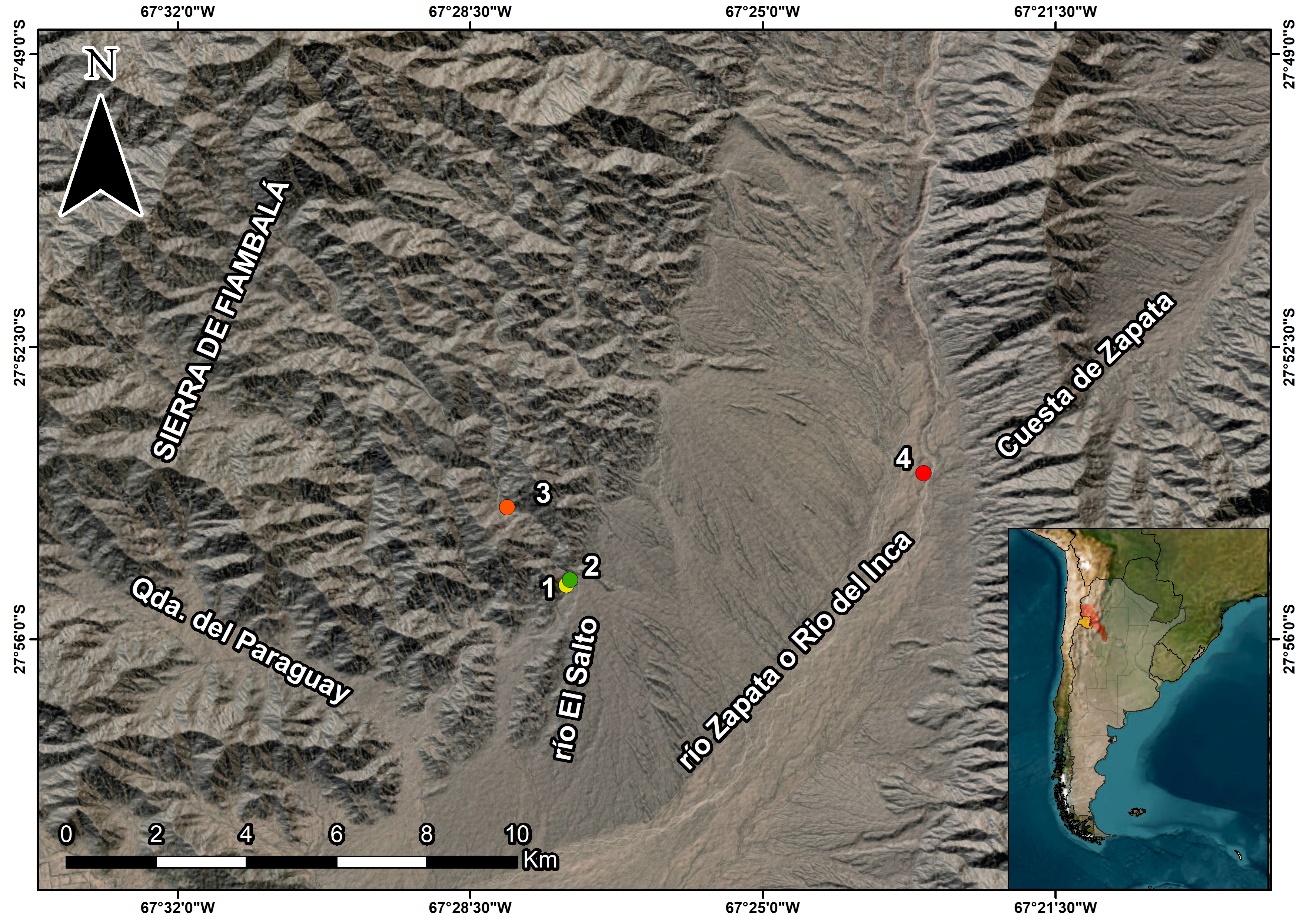 Mapa de ubicación de los sitios: (1) El Salto-1 (grabados y morteros), (2) El Salto-2 (residencial), (3) la mina de estaño Vil Achay en la Sierra de Fiambalá, (4) Rio del Inca-Lucke y conectores naturales que articulan con los valles de oriente y occidente.