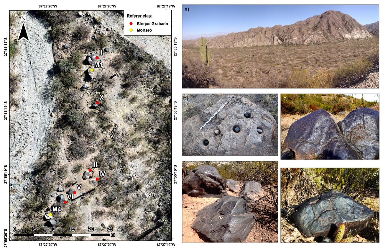 El sitio denominado El Salto-1 (ES-1) está conformado por 10 bloques de granito y gneiss de textura fina, característicos de las Sierras de Fiambalá (Fogliata y Ávila, 2004). Los bloques se disponen de manera aislada (I, II, VII, X) o agrupada (III-IV-V-VI; VIII-IX) en la terraza fluvial del río El Salto, 2 km al sur de la mina Vil Achay (Figuras 1 y 2). El área fue modificada por la apertura de una huella vehicular.
