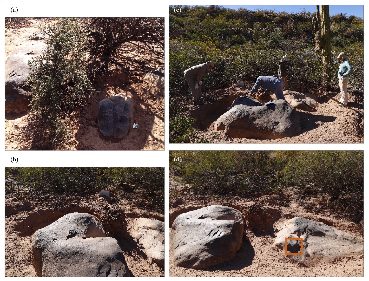 Proceso de destape de los bloques III y IV parcialmente sepultados. (a) vista del estado inicial donde se observa el único segmento visible del bloque IV. (b) y (c) trabajos de remoción del sedimento y la vegetación. (d) vista de los dos bloques ya destapados donde se destaca el único sector del bloque IV que se visualizaba antes de dichas tareas.