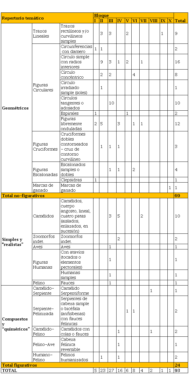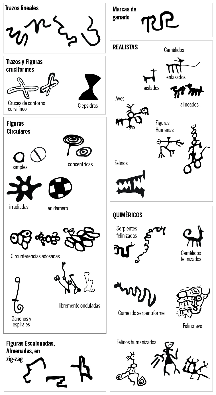 Para organizar las imágenes documentadas utilizamos como base y como referencia la propuesta de clasificación en categorías de conjuntos de clases, clases y subclases de representaciones elaborada por Aschero (1999, 2006) para el estudio del arte rupestre de la vecina región de Antofagasta de la Sierra (ANS). Allí se observa una continua producción de manifestaciones rupestres desde momentos arcaicos hasta tiempos históricos y una intensa reutilización de los soportes y sus imágenes a lo largo de este amplio lapso. La fina calibración cronológica de cada una de las modalidades definidas para ANS a lo largo de esos 10.000 años convierte esta secuencia en una base de referencia fundamental que fuimos ajustando, a partir de los trabajos realizados, a la realidad visual de nuestra región de estudio (Ratto y Basile, 2009; Basile, 2012; entre otros).