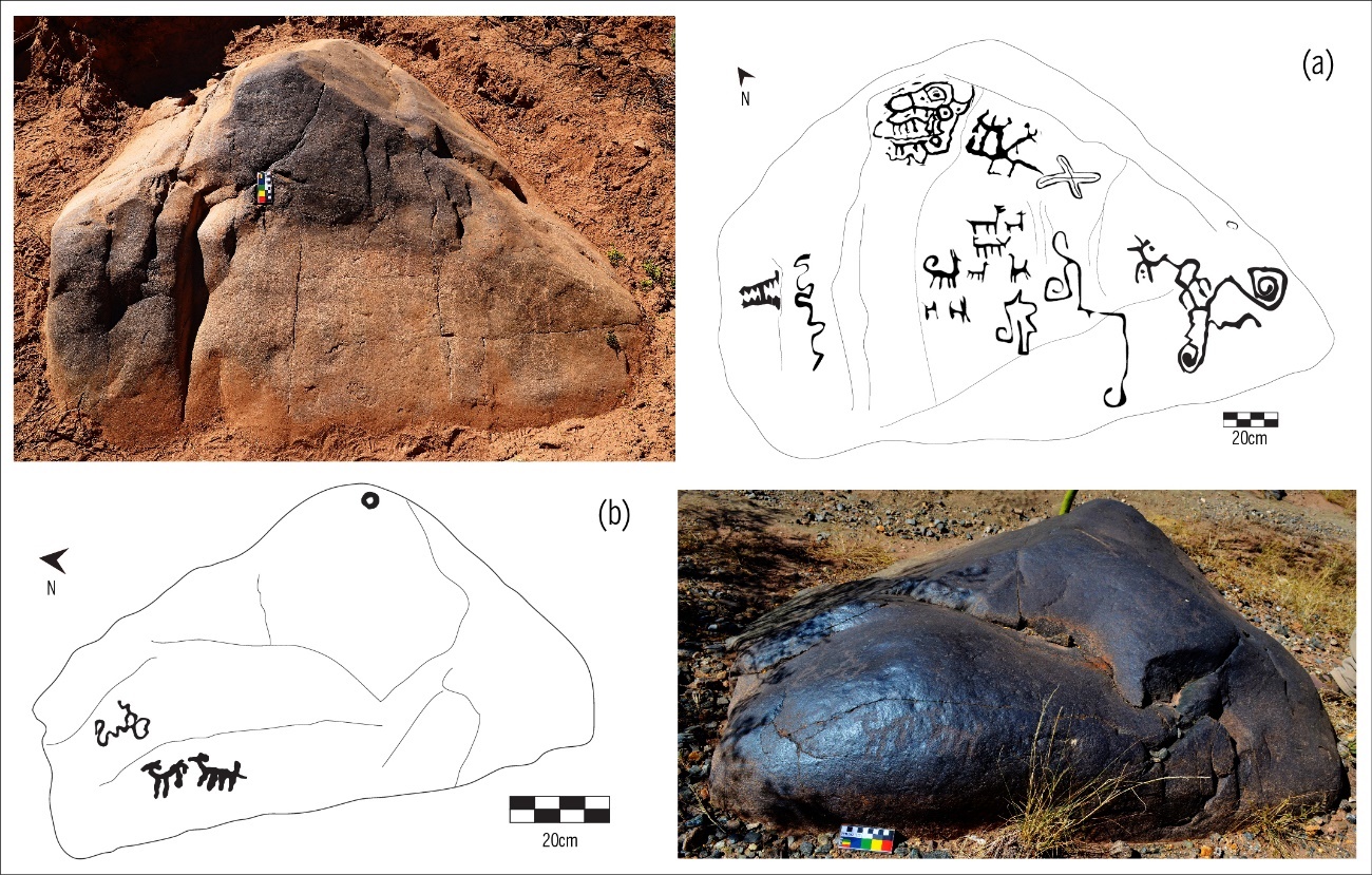 Abstract: We report the first survey conducted at the site El Salto-1, composed of a set of 10 (ten) engraved blocks scattered on the fluvial terrace of the El Salto river and ravine, in the eastern foothills of the Fiambalá mountain range, Tinogasta, Catamarca. We analyzed the thematic repertoire displayed in each block, recording the types of motifs, the technique of execution and evaluating the existence of overlaps and differences in the patina tonalities. We have also considered the importance of taking into account the conditions of placement, at the level of the site and of each block, to define the contexts in which these images participated. In this regard, archaeometallurgical work and ongoing research have shown the importance of tin, copper, and other minerals in the Sierras de Fiambalá and Zapata, their relationship with pre-Hispanic metallurgy, both during the Inca conquest and before, and also the different strategies implemented to control them over time. In this context, our working hypothesis is that the engravings of the site El Salto-1 are related to different stages of the metallurgical operational chain, especially to the processing of tin deposits, without excluding aspects of defense, control, and/or regulation of access to the large mineralized areas.