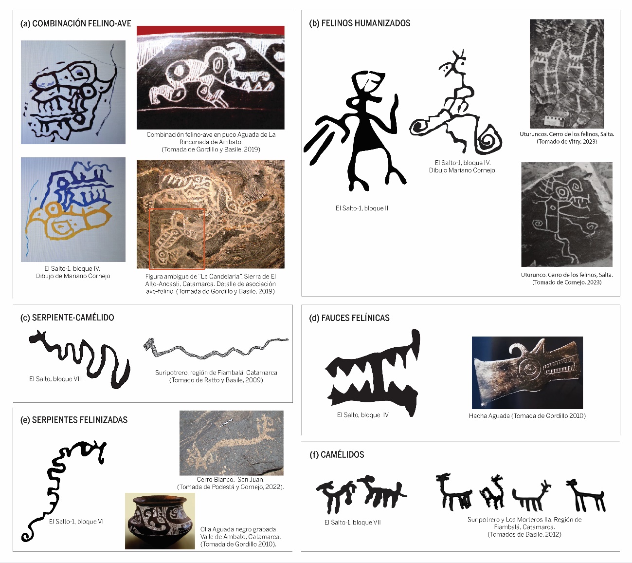 (a) felino-ave reversible del bloque IV, vista en posición frontal y rotada 180° donde se destaca el ave incorporada en la figura felínica y ejemplos de combinaciones similares en alfarería y arte rupestre Aguada (tomadas de Gordillo, 2010 y Gordillo y Basile, 2019); (b) humanos felinizados de los bloques II y IV e imágenes semejantes grabadas en la Cueva de los Felinos, Salta (tomadas de Vitry, 2023 y Cornejo, 2023); (c) Serpiente camélido del bloque VIII e imagen similar grabada en el sitio Suripotrero; (d) Fauces del bloque IV y hacha de bronce Aguada (tomada de Gordillo, 2010); (e) Serpiente felinizada del bloque VI e imagen similar grabada en Cerro Blanco, San Juan (tomada de Cornejo y Podestá, 2022) y olla Aguada negro grabada del valle de Ambato, Catamarca (tomada de Gordillo, 2010); (f) camélidos del bloque VII e imágenes similares grabadas en los sitios Los Morteros y Suripotrero.