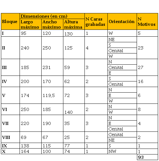 Fuente: Proyecto Arqueológico Chaschuil-Abaucán (PACh-A).Los bloques grabados definen cuerpos geométricos poliédricos irregulares con caras planas o curvas, por lo que la orientación de las áreas sujetas a posible intervención visual son variables. La altura de los bloques varía entre los 25 y los 140 cm (Tabla 1) y la mayoría de ellos presenta más de una cara grabada (7:10) por lo que su observación completa demanda la circulación del observador a su alrededor. Estos mayormente se encuentran alineados siguiendo la orientación N-S del cauce del río y se van detectando a medida que el observador va transitando por la terraza, acercándose a cada uno de ellos.