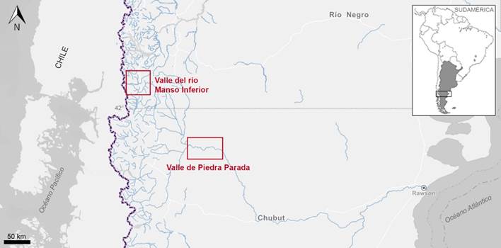 Se procesaron por medio de microespectrometría Raman nueve artefactos y ecofactos arqueológicos recuperados en los sitios Población Anticura y Paredón Lanfré del valle del río Manso inferior (Río Negro) en ambiente de bosque y los sitios Campo Cretton 1, Campo Moncada 2 y Campo Cerda 1 (en los cuales la conservación de la evidencia orgánica es excelente) en el valle medio del río Chubut (Piedra Parada), en ambiente de estepa. Se analizaron, además, cinco hallazgos aislados de diversas rocas de tamaño guijarro o guijón (16 a 64 mm y 64 a 256 mm, de acuerdo con la escala de Udden-Wenworth, en Teruggi 1982) provenientes de esta misma región (Figura 1 y Tabla 1).