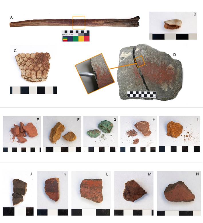 a) Posible “atizador” de Berberis sp. con mancha rojiza a lo largo (Pérez de Micou 1980). b) Pequeño gasterópodo con mancha rojiza en el interior (inédito). c) Fragmento de caparazón de Zaedyus pichiy sp. con adherencia rojiza en superficie interna (posiblemente usada para preparar la pintura, “paleta”) (Bellelli, 1994). d) Roca plana (molino) con adherencia rojiza en cara plana, posiblemente con la misma función que la pieza anterior (Bellelli, 1994; Bellelli et al., 2007). e-i) Fragmentos de rocas que en forma de guijarros o guijones están disponibles en todo el valle, posible materia prima para la preparación de las mezclas pigmentarias (inéditos). j) Tres fragmentos de un mismo tiesto que remontan (Fernández et al., 2019; Bellelli, 2020). k) Tiesto. Superficie externa con dos franjas rojas de diferentes tonalidades (Fernández et al. 2019, Bellelli, 2020). l) Tiesto. Superficie externa con engobe o pintura rojiza (Fernández et al. 2019, Bellelli, 2020). m) Tiesto. Superficie externa con dos franjas de diferentes tonos de rojo (Fernández et al., 2019; Bellelli, 2020). n) Tiesto. Superficie externa con engobe o pintura rojiza (Fernández et al., 2019; Bellelli, 2020).