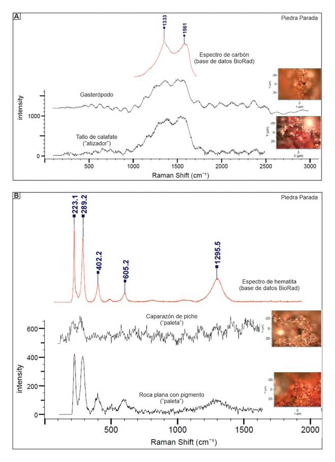 a) Espectros Raman obtenidos del tallo leñoso (atizador) y del gasterópodo donde se determinó carbón, con las micro-fotografías en las que se indica con un punto rojo dónde se realizó el análisis. La línea roja es la comparación con el espectro de carbón de la base de datos BioRad. b) Espectros Raman de los dos artefactos con adherencias rojizas (caparazón de piche y molino de piedra) en los que se determinó hematita. Arriba, la línea roja es la comparación con el espectro de hematita de acuerdo con la base de datos BioRad.
