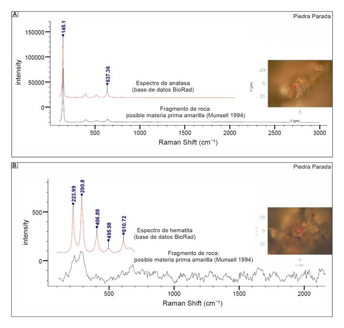 En la Figura 3b se presentan los espectros obtenidos de las adherencias que tienen las superficies del fragmento de caparazón de piche (Zaedyus pichiy sp) con pigmento en su interior y la roca con abundante pigmento sobre la cara plana, que sugieren su uso como soportes para la preparación y uso de las pinturas (posibles “paletas”) (Figura 2c y d, marrón rojizo y rojo respectivamente). En el primer caso se obtuvo un espectro Raman con baja resolución, donde se determinaron bandas que corresponden a óxido de hierro[3] mientras que en el segundo caso se determinó la composición del polvo raspado de la "paleta" y el resultado fue hematita.