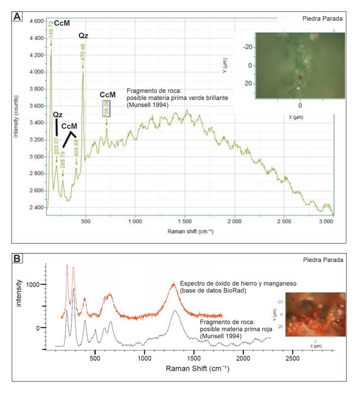 Se utilizó un microespectrómetro Raman HoribaXploRA PLUS, montado en microscopio Olympus con una cámara externa Infinity2 Lumenera que permite la visualización del punto de interés. Se utilizó un láser de 532 nm, con filtro de 25% para disminuir la intensidad de este, dado que las muestras contienen carbón y óxidos de hierro que son sensibles a la energía del láser. En cuanto a los parámetros de medición, se utilizó una grilla de 1200 gr/mm, un tiempo de adquisición por espectro de 10 segundos, con 3 acumulaciones y apertura de láser que permite analizar un área de 2 a 5 µm. Los espectros fueron analizados y procesados mediante el programa LabSpec, con la base de datos de BioRad disponible en dicho programa para la comparación con espectros de referencia. Los espectros se obtuvieron en el rango de 100 a 3000 cm-1 recortando algunos en distintos valores de Raman Shift en los casos en los que se necesitó mayor detalle. Los programas utilizados, permiten realizar una corrección automática de la fluorescencia aplicando una línea de base. También se utilizó la base de datos RRUFF Database: Raman, X-ray, Infrared, and Chemistry (Lafuente, Downs, Yang y Stone, 2015) disponible en internet y las tablas publicadas por Frezzotti, Tecce y Casagli (2012).