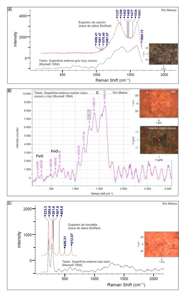 Espectros Raman de los fragmentos cerámicos. a) Tiesto gris oscuro (Figura 2j) en el que se determinó carbón (línea negra), la línea roja es la comparación con carbón de acuerdo con la base de datos BioRad. b) Tiesto con dos franjas (Figura 2k). En la oscura se determinó carbón (C), y en la roja, más clara, además, se identificó óxido de hierro (FeO). c) El espectro Raman del tiesto de Figura 2l muestra en negro la banda correspondiente a hematita y en rojo la comparación con la base de datos BioRad.