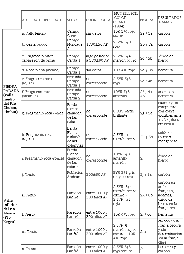 Se vuelca la información referida al sitio en que se recuperó cada pieza, la cronología, la tonalidad, la referencia a la figura en la que se ilustra cada una de ellas y los resultados obtenidos.