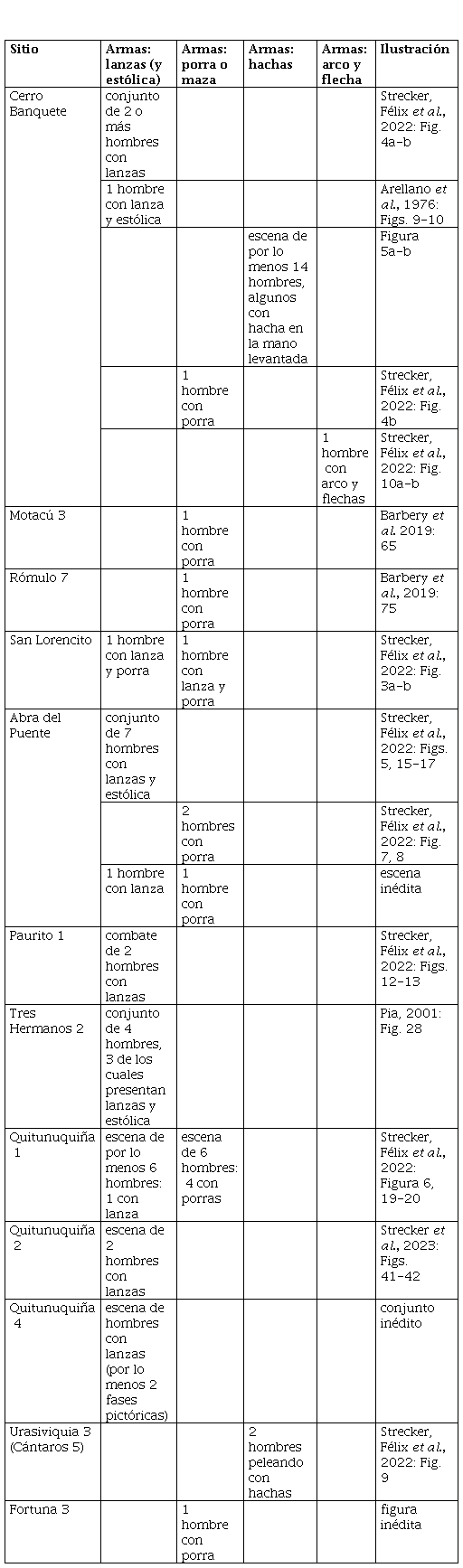 Constatamos por lo menos 12 sitios con representaciones de hombres armados que interpretamos como guerreros (Tabla 1). Hacemos notar que además existen escenas de caza con la representación de animales y hombres armados con lanzas, a veces también con estólica.