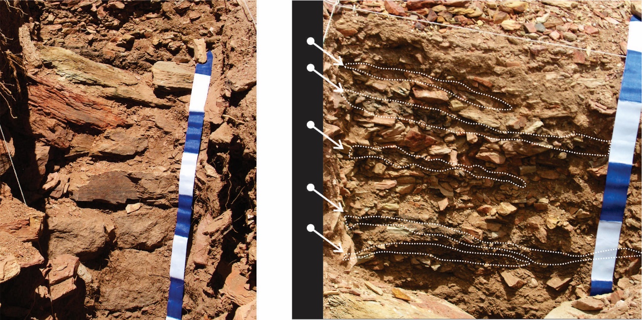 Izquierda: segmento de muro- Estrato II. Derecha: lentes de ceniza alternadas con cascajo- Estrato VI.