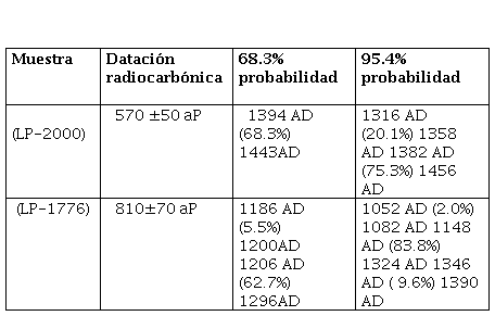Se realizaron dos dataciones, la más antigua (LP- 1776) con carbones dispersos recolectados del Estrato V y la segunda del tope del estrato VI donde se conservaba una fina capa de paja carbonizada (LP- 2000) (Figura 4). Como se puede observar en la tabla No 1 las muestras presentan un alto rango de amplitud temporal (entre 1148-1324 AD y 1382-1456 AD). En un artículo anterior planteamos que la ocupación del poblado se produjo durante los siglos XI al XV, definiéndose cuatro fases: inicial, crecimiento, modificaciones y abandono (Albeck et al., 2019). El fechado LP-1776 810 ± 70 AP del montículo se encuentra entre aquellos más antiguos del sitio, conformando la etapa inicial; en tanto el fechado LP-2000 570 ± 50 AP se encuentra en la fase de crecimiento del sitio[6].