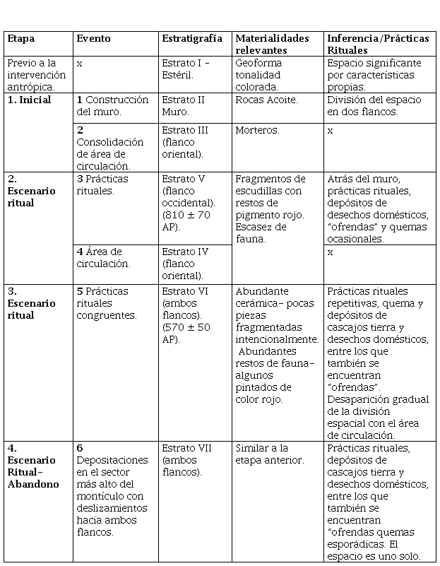 En una primera etapa se considera la intervención arquitectónica de la cumbre con afloramiento rojizo, ordenando y dando sentido a un espacio particular; luego se identifican tres etapas con depósitos antrópicos que expresan modificaciones que pueden ser entendidas como cambios en las prácticas realizadas sobre un mismo espacio.