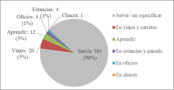 Sobre las tareas a realizar por los indios contratados contamos con pocos datos ya que el 90% de nuestras fuentes no indica mayores especificaciones que la de comprometerse a “servir”, siendo probablemente utilizados en una gran variedad de trabajos. En los pocos conciertos que detallan una tarea específica se menciona hacer viajes y servir con las carretas y mulas, de aprendiz, en estancias o con guarda de ganado, en un oficio, o en una chacra.