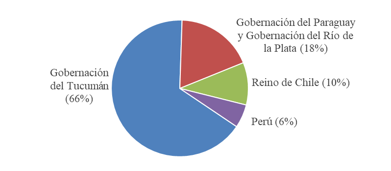 La procedencia de los indios concertados en Córdoba entre 1612 y 1645, presenta un gran nivel de diversificación, con preponderancia de la Gobernación del Tucumán y participación secundaria de otras regiones externas (Perú y Charcas, Paraguay y Río de la Plata). Entendemos que el lugar que tuvo la gobernación como principal proveedora de mano de obra concertada, fue el resultado de –además de la cercanía- la creación de un marco normativo que permitía la concertación al margen de las relaciones de encomienda sin que fuera legalmente incompatible con las obligaciones tributarias, y promovía su registro formal ante escribano. Algo similar encontró Gabriela Sica en su estudio sobre los conciertos de indios realizados en Jujuy entre 1620 y 1630, procedentes en su mayoría de la Gobernación del Tucumán (Sica, 2018: 21).