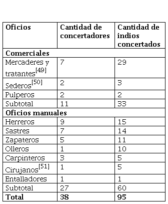 Nos preguntamos cuáles eran los sectores españoles con necesidad de mano de obra. En el siguiente cuadro vemos que unos 95 indios fueron contratados por 38 no encomenderos con oficios, representando un 18,6% sobre el total de 509 concertados en el período.