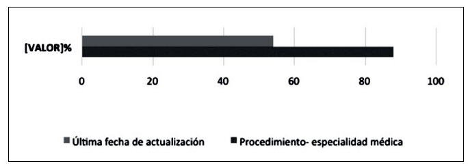 Antes de revisar presencia de categorías en los formatos, se tuvo en cuenta si se registraban en ellos dos aspectos formales importantes: fecha de actualización y si especificaban el procedimiento que se iba a consentir en el formato; así, se encontró que la fecha de actualización la presentaban el 57 % de los formatos y el tipo de procedimiento y especialidad médica, el 88,6 %.