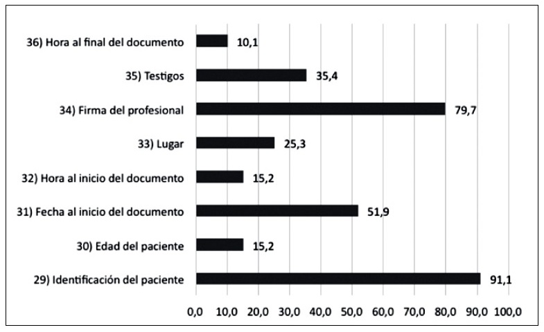 En las categorías deseables en los formatos de consentimiento informado, la identificación del paciente posee el más alto cumplimiento, con un 91 % y la firma del profesional está con un 80 %; con menor cumplimiento se ubican "hora al inicio del documento", con el 15 % y hora final de documento, con un 10 %.