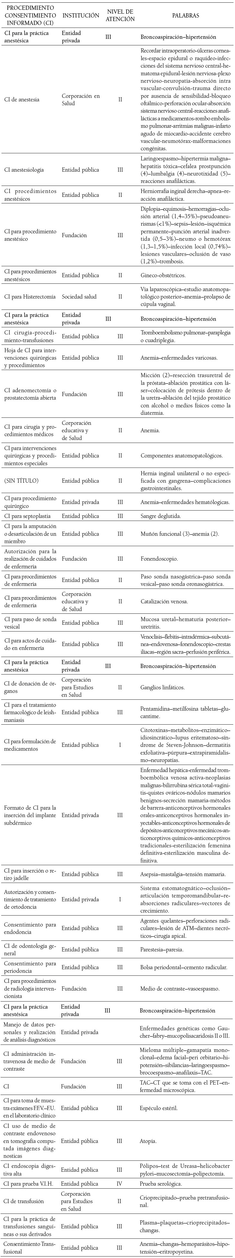 Se recolectaron 80 formatos de uso frecuente (151 folios) de 22 instituciones de diferentes niveles de atención(públicas y privadas)(hospitales, EPS,IPS), en 13 actividades clínicas diferentes, de tres ciudades de Colombia y tres municipios diferentes, accediendo a ellos como lo haría cualquier usuario de servicios de salud: de esta manera varía la metodología que se tenía planteada inicialmente: recopilar 50 formatos en cinco instituciones solicitando los más usados, esto en razón a la negativa, temores y recelos mostrados por diferentes instituciones a las que se acudió en un primer momento; luego, porque el equipo investigador se encontró con la dificultad de acceder a 10 formatos por institución, pues algunas solo manejan un formato para diversos procedimientos y estos, en su mayoría, no se encuentran centralizados o se puede acceder a una lista de los más usados. En la práctica, lo que pudimos observar es que en la mayoría de instituciones cada servicio resuelve el asunto a su manera y entregan el documento momentos antes de realizar los procedimientos. Algunas instituciones solo tienen un formato de CI genérico, para varios procedimientos.