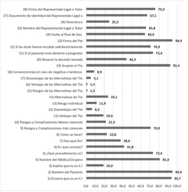El más alto cumplimiento por encima de 90% y sin llegar al total, se observa en categorías como: 1.Enuncia que es un C.I; 2. Nombre del paciente; 19. Aceptación del tratamiento o procedimiento; 23.Firma de paciente, con muy bajo cumplimiento por debajo del 10%; 15. Riesgos; 16 y 17. Ventajas y desventajas de las alternativas del tratamiento; y 12. Desventajas del tratamiento o procedimiento.