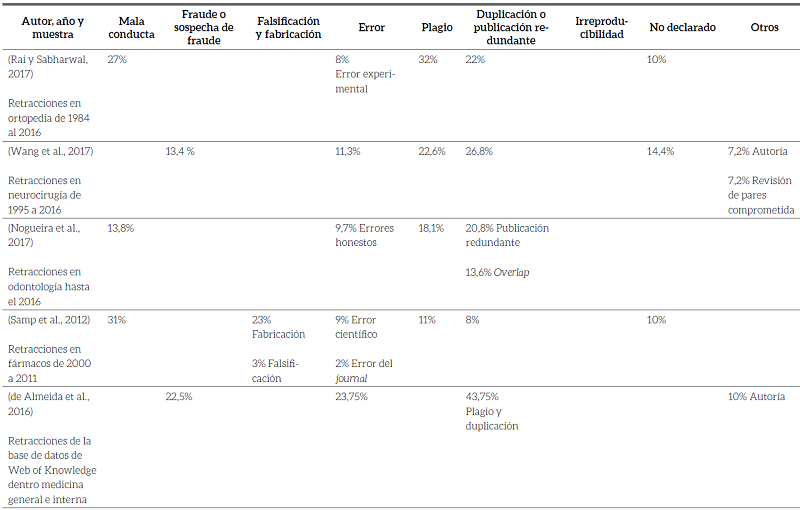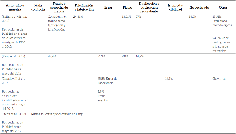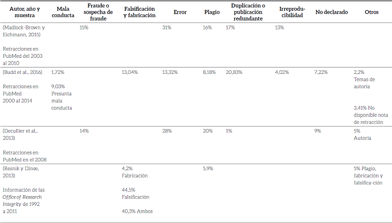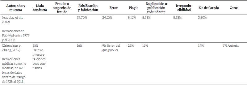 Un estudio que revisa los hallazgos de la Office of Research Integrity1 en los Estados Unidos, entre 1992 y el 2011, encontró que solo el 41,2% de las retracciones indican la mala conducta, pero creen que el bajo porcentaje se debe a aspectos legales relacionados con que la investigación por la mala conducta no ha concluido antes de la publicación de la nota de retracción. No obstante, también pareciera que algunos autores tratan de cubrir la mala conducta apelando a otros problemas tales como errores, pérdida de datos o falla a la hora de replicar los resultados (Resnik y Dinse, 2013). Además, cuando la información de las noticias de retracción se cruza con la de la Office of Research Integrity, la clasificación de la razón de retracción cambia en algunas ocasiones (Fang et al., 2012).