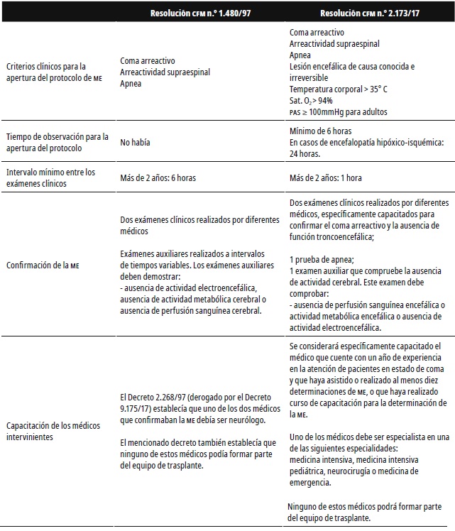 El artículo 9° de la citada resolución establece que después de la confirmación de la muerte encefálica el director clínico del hospital, o persona por él indicada, debe notificar a los responsables legales por el paciente sobre el diagnóstico, así como informar al Centro de Notificación, Captación y Distribución de Órganos vinculado al hospital. Las principales diferencias entre la Resolución n.° 1.480/97 y n.° 2.173/17 pueden verse en la tabla 1.