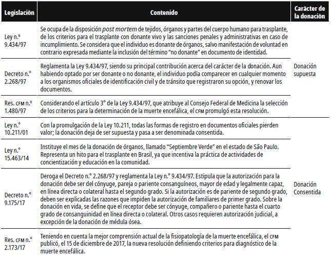 La resolución también corrobora la decisión de la Resolución CFM n.° 1.826/07, que otorga al médico la autoridad ética y legal para suspender los procedimientos y el soporte terapéutico en uso cuando es constatada la muerte encefálica, excepto si se trata de un donante de órganos, tejidos o partes del cuerpo humano para trasplante (CFM, 2017). La tabla 2 ilustra los marcos legales del proceso de donación y trasplante en Brasil.