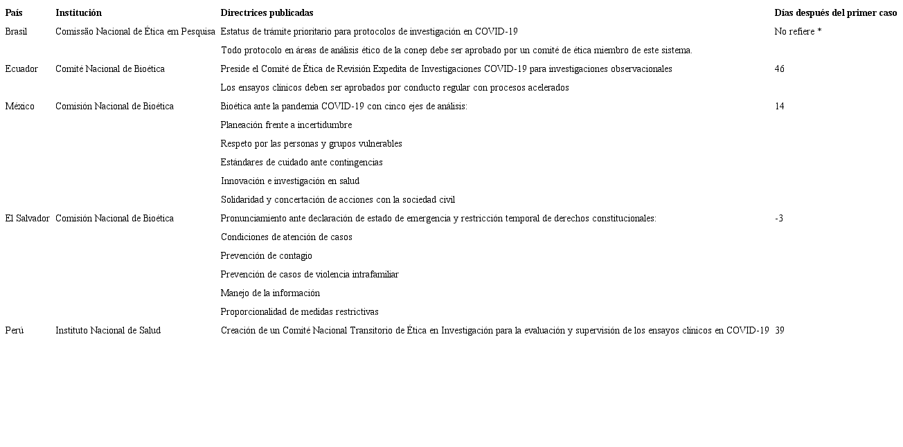 En estas circunstancias, la bioética ocuparía un rol fundamental como una disciplina bisagra y transversal a todos los problemas planteados al brindar enfoques humanizados al momento de analizar y tomar decisiones en los dilemas clínicos, de investigación y de conflictos sociales 3. Los sistemas nacionales de vigilancia(bio) ética (llámense comisiones, comités, consejos, juntas, redes) que existen en diferentes países del mundo cumplen ese rol en el contexto de una pandemia. Para evaluar la respuesta de estos sistemas a nivel de Latinoamérica, se realizó una búsqueda de recomendaciones en el marco de la pandemia por el COVID-19, en sistemas éticos constituidos en Argentina, Bolivia, Chile, Colombia, Cuba, Ecuador, El Salvador, México, Paraguay, Perú, República Dominicana, Uruguay y Venezuela. Solo se encontraron recomendaciones generales en dos países y directrices en ética en investigación en tres de ellos (Tabla 1).