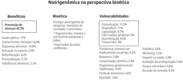 Summary: Nutrigenomics has positioned itself, in the scientific and popular context, as an alternative to prevent diseases, which genetically determined predisposition can be avoided or encouraged, depending on the context the individual is at. The study investigated the potential of nutrigenomics in mitigating or generating vulnerabilities. The purpose was to establish the panorama of nutrigenomics in Brazil from the perspective of Bioethics. The study consisted of a quantitative mapping of the nutrigenomics panorama in the scientific and popular context of Brazil, and of an exploratory bibliographic analysis in order to identify moral agents and patients, as well as vulnerabilities to promote reflection in light of Bioethics. The scenario of nutrigenomics in Brazil, built from 18 scientific texts and 600 popular contents, evidenced the prematurity of the area in the scientific context in comparison with a wide incorporation by the popular media. The incorporation of Bioethics in the debate was analyzed in 44 scientific articles, from which the philosophical, biological, cultural, legal and health contexts in which it is found were identified as conditioning aspects of decisions of the moral agent. The vulnerabilities and paradigm changes necessary to implement it in Brazil were related, in order to mitigate the potential for generating vulnerabilities. Bioethics can and should have a broader and more effective action on nutrigenomics questionings by normalizing and guiding the development of this promising area. Thus, it must aim at paradigm shifts in science, professionals, the market, the patient and the consumer so that the potential aspects of generating the identified vulnerabilities are eliminated and contribute to the quality of life of all living beings in the world of this and future generations.