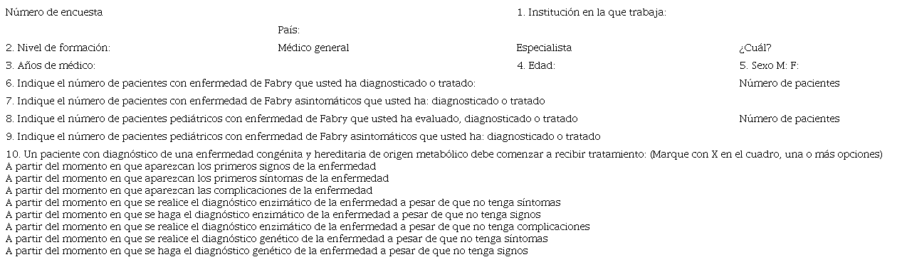 Se diseñó un cuestionario con formato de preguntas cerradas que permitieron caracterizar la muestra (edad, sexo, especialidad, tiempo de ejercicio profesional y experiencia en pesquisa, diagnóstico y tratamiento de pacientes con enfermedad de Fabry), así como preguntas que permitieron evaluar la aplicación de los principios de no maleficencia, justicia y sacralidad de la vida. Los médicos pudieron escoger más de una opción de respuesta para evaluar de manera integrada la aplicación de estos principios en su práctica. El instrumento de recolección de datos fue validado por juicio de expertos.